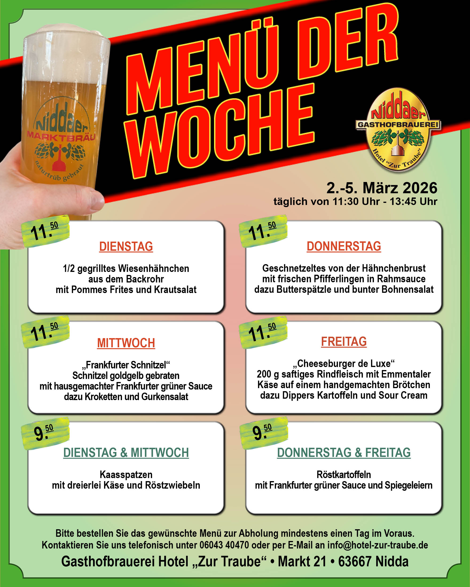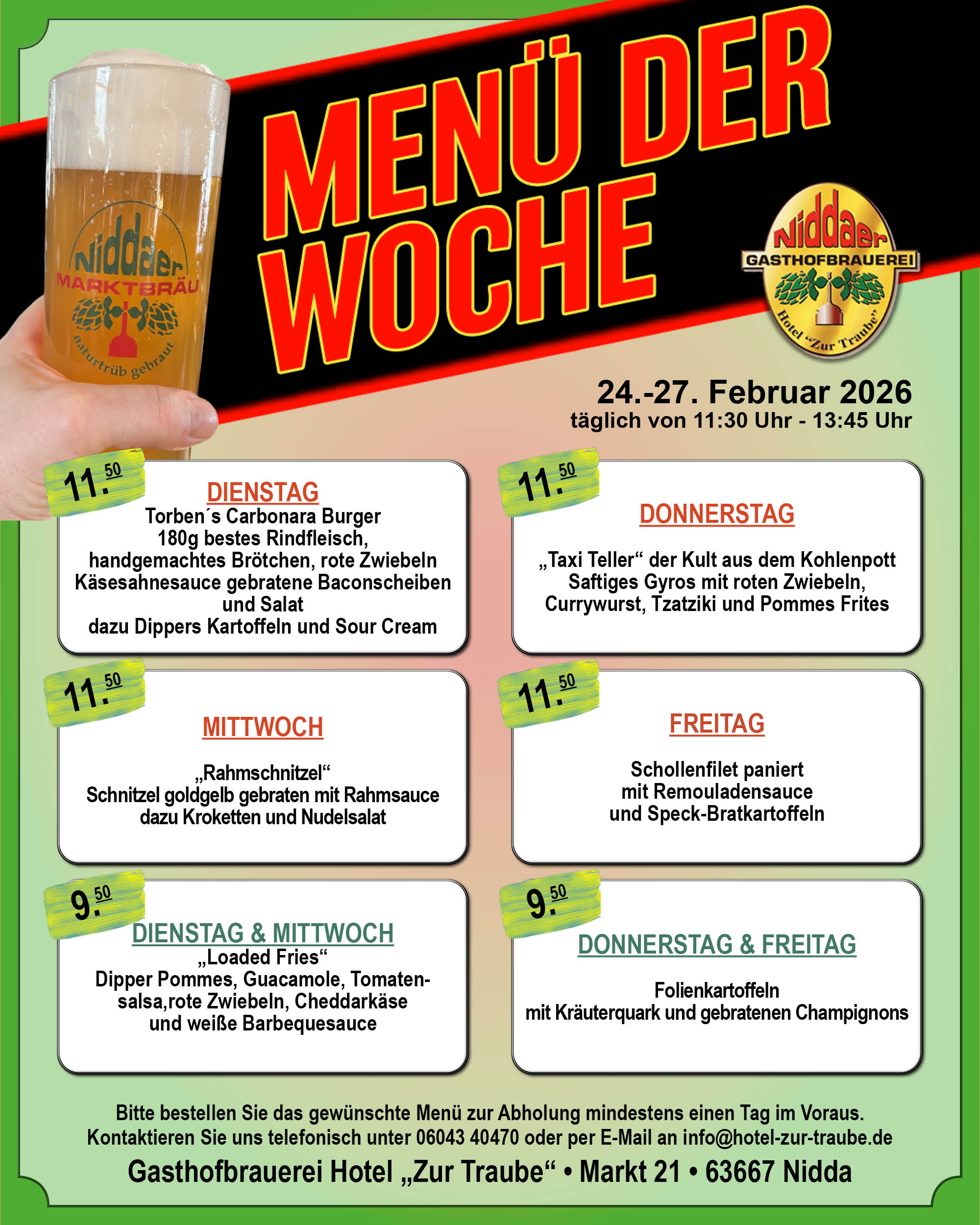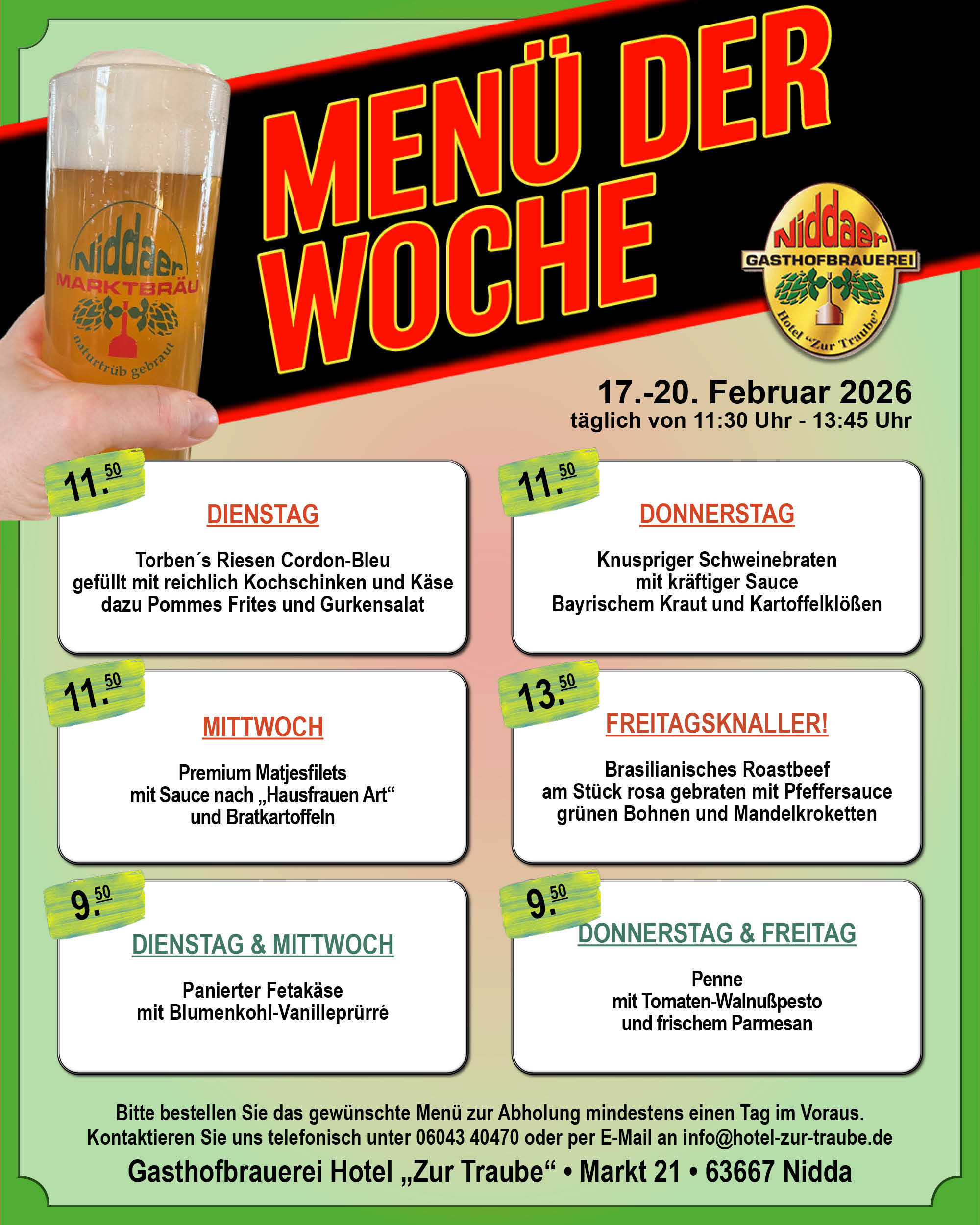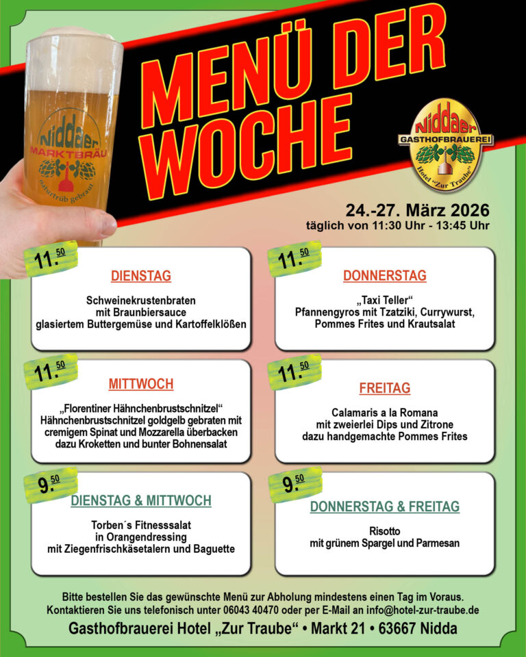 Das Hotel zu Traube oder „Traube“ wie sie im Volksmund genannt wird, wurde bereits im Jahre 1840 eröffnet und ist eine gastronomische Institution in Oberhessen. Nach dem verheerenden Brand im Februar 1996 wurden Restaurant und Hotel um eine eigene Brauerei in den Kellerräumen ergänzt. Seit nunmehr 22 Jahren besteht dieses neue gastronomische Konzept in unserem Traditionsgasthaus am historischen Niddaer Marktplatz. Wir knüpfen damit an eine Jahrhunderte alte Brautradition in Nidda an und sind gleichzeitig die einzige Brauerei in der Region.